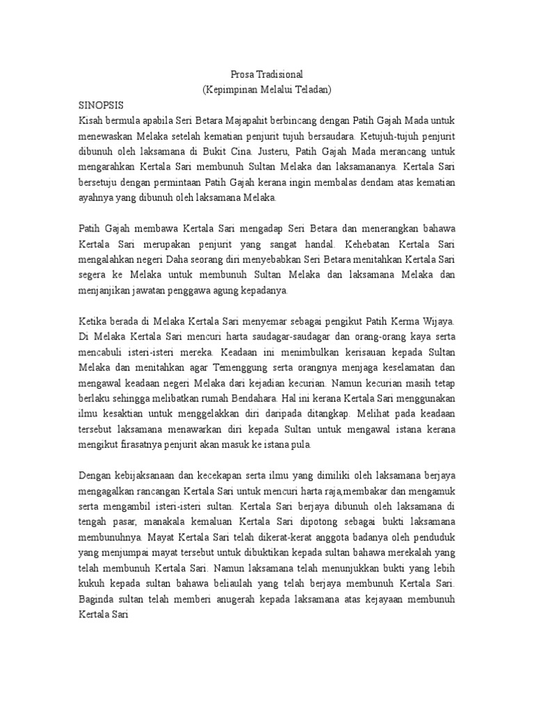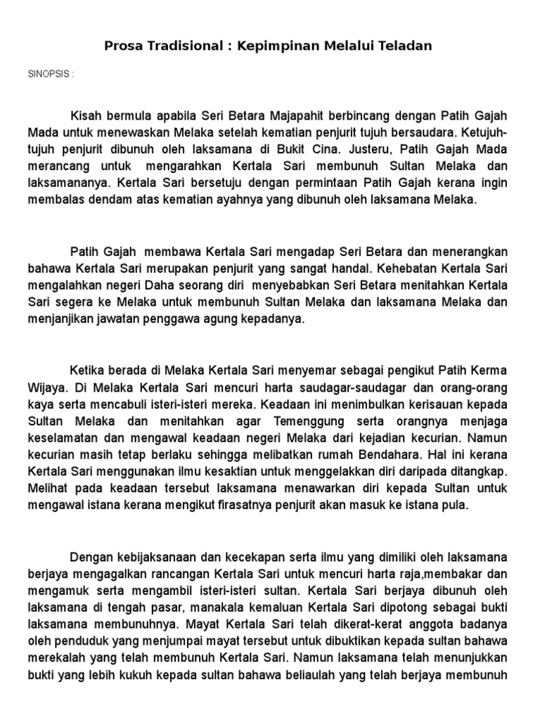 Prosa tradisional kepimpinan melalui teladan: Sinopsis kisah bermula apabila seri betara majapahit berbincang dengan patih gajah mada untuk menewaskan melaka setelah kematian penjurit tujuh bersaudara. Sinopsis kisah bermula apabila seri betara majapahit berbincang dengan patih gajah. Soalan pemahaman kepimpinan melalui teladan cikguphong. Kertala sari menerima tugas itu kerana ingin membalas dendam atas kematian ayahnya.
